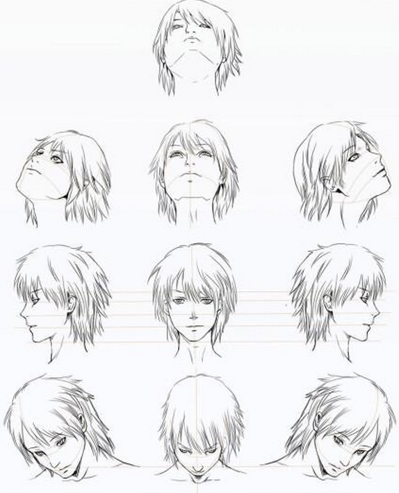 画出头部和确定五官位置的最好办法,就是画出辅助线条并画透以突出立体感,这些线条因头部倾斜而倾斜。注意中心线必须穿过前额,鼻子,嘴唇和下巴的表面。在头部做任何动作的情况下,都要确保中心线位置的正确,这样才有助于确立五官的相对位置。