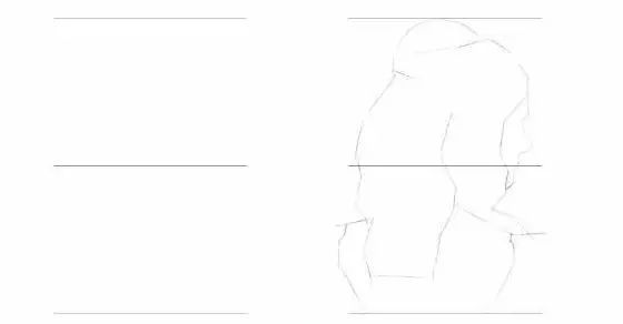 2、注意观察每个等份中所包含的线条,画出头发和人物的基本外轮廓,如下右图所示