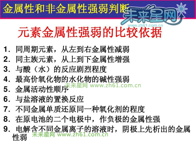 金属性:金属气态原子失去电子能力的性质;金属活动性:水溶液中,金属原子失去电子能力的性质。注:金属性与金属活动性并非同一概念,两者有时表现为不一致,诸如Cu与Zn:金属性Cu>Zn,而金属活动性Zn>Cu。1、同周期中,从左向右,随着核电荷数的增加,金属性减弱;同主族中,由上到下,随着核电荷数的增加,金属性增强;2、依据最高价氧化物的水化物碱性的强弱;碱性愈强,其元素的金属性也愈强;3、依据金属活动性顺序表(极少数例外);4、常温下与酸反应煌剧烈程度;5、常温下与水反应的剧烈程度;6、与盐溶液之间的置换反应;7、高温下与金属氧化物间的置换反应。5:比较非金属性强弱的依据