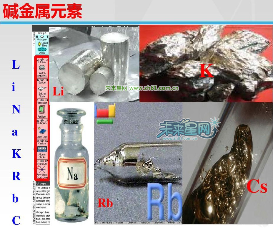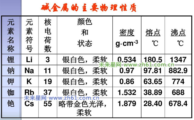 1、Na、K均保存在煤油中,防止氧化,但锂单质不能保存在煤油中,因锂单质密度小于煤油,浮于煤油液面,达不到隔绝空气的目的,应保存太平石蜡中。2、碱金属单质的密度一般随核电荷数的增大而增大,但钾的密度却比钠小。3、碱金属单质在空气中燃烧大部分生成过氧化物或超氧化物,但锂单质特殊,燃烧后的产物只是普通氧化物。4、碱金属单质和水反应时,碱金属一般熔点较低,会熔化成小球。但锂的熔点高,不会熔成小球。生成的LiOH溶解度较小,覆盖在锂的表面,使锂和水的反应不易连续进行。5、碱金属单质和水反应时,碱金属单质一般浮于水面上,但铷、铯等单质和水反应时沉入水底,因铷、铯单质的密度比水大。6、钠盐的溶解度受温度的变化影响一般都较大,但NaCl的溶解度受温度变化的影响却很小。7、碱金属的盐一般均易溶于水,但Li2CO3却微溶于水。8、焰色反应称为“反应”,但却是元素的一种物理性质。