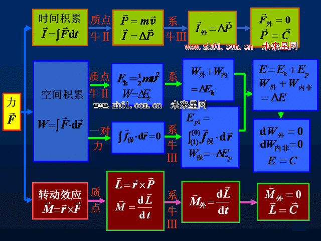 表述角动量与力矩之间关系的定理。对于质点,角动量定理可表述为:质点对固定点的角动量对时间的微商,等于作用于该质点上的力对该点的力矩。对于质点系,由于其内各质点间相互作用的内力服从牛顿第三定律,因而质点系的内力对任一点的主矩为零。利用内力的这一特性,即可导出质点系的角动量定理:质点系对任一固定点O的角动量对时间的微商等于作用于该质点系的诸外力对O点的力矩的矢量和。由此可见,描述质点系整体转动特性的角动量只与作用于质点系的外力有关,内力不能改变质点系的整体转动情况。